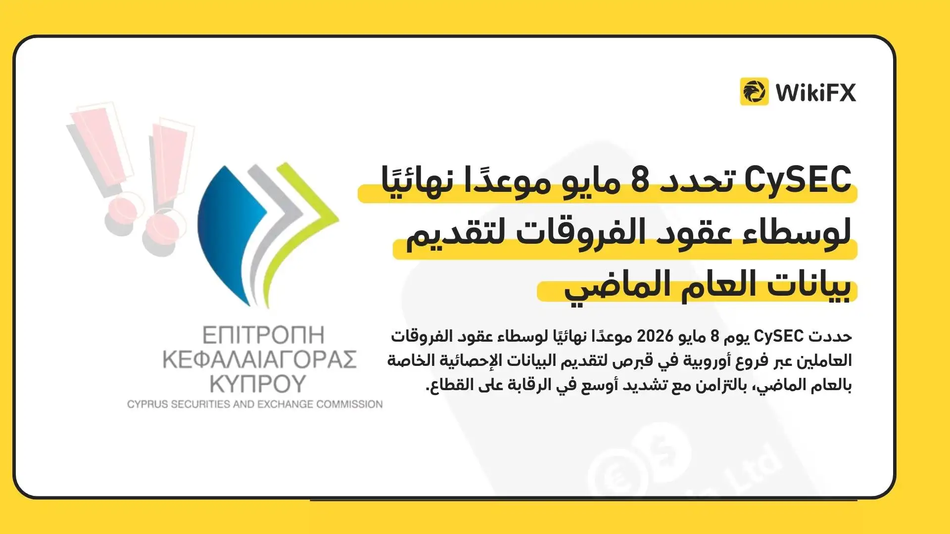 حددت CySEC يوم 8 مايو 2026 موعدًا نهائيًا لوسطاء عقود الفروقات العاملين عبر فروع أوروبية في قبرص لتقديم البيانات الإحصائية الخاصة بالعام الماضي، بالتزامن مع تشديد أوسع في الرقابة على القطاع.