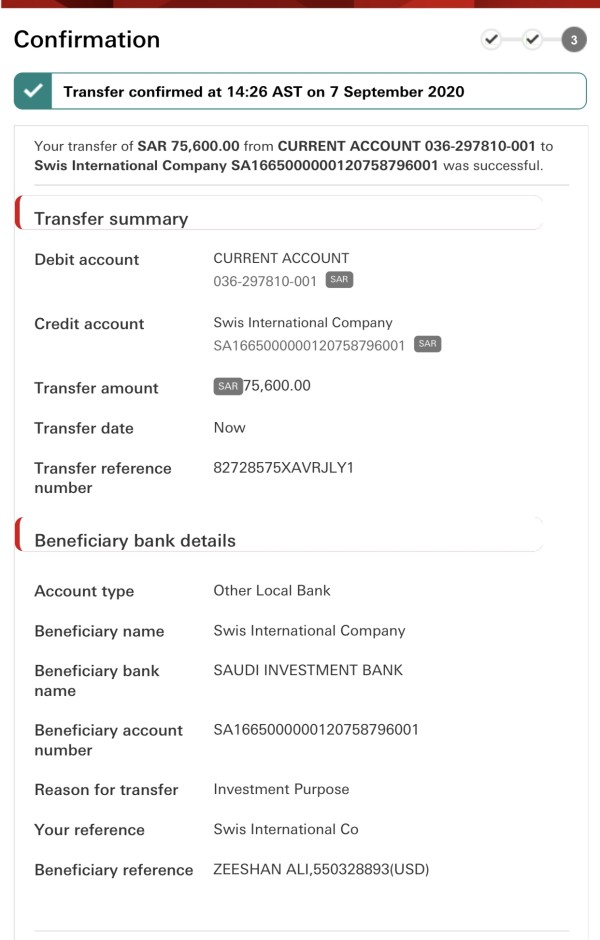 Kindly note the bank tranfer detail of USD 10,000 which was transfered to "Swiss International Company" in in AWAL Bank “SA65500000010694964009” on 26 Aug 2020.