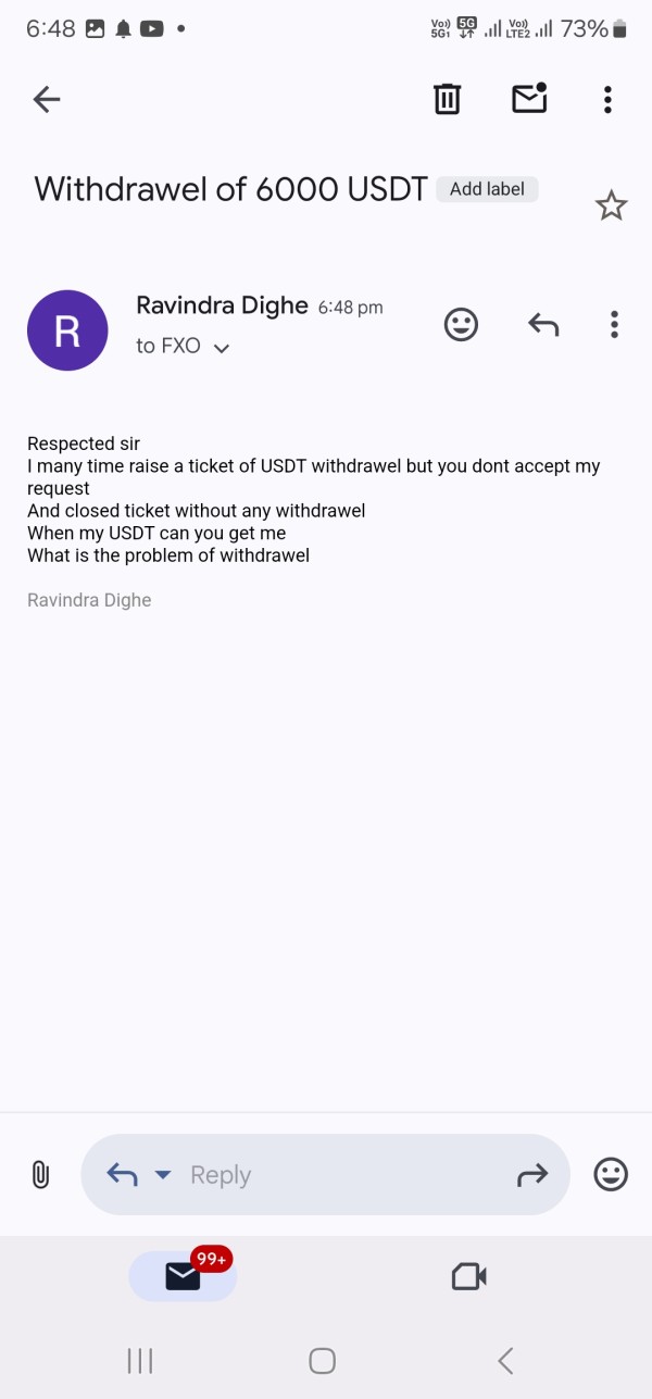 I invested in my hard cash [ Gold Loan ] i.e 5 lacks rupees [5555 USDT] March2024 after that i many time mail fxopulance withdrawel my usdt but they mailed me 2 or 3 months we not transfer usdt due to cyber attack , then after 3 months fxopulance broker does not gave me my money