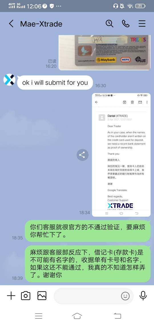 平台要做验证这是正常的,我已经按照平台要求发了文件,一直无法通过。由于本人是使用借记卡入金,马来西亚借记卡上不会有显示名字,账单上也不会显示卡号码和名字,没办法下,我就发了一张消费凭证上面有卡号和名字,最后他们还是给我理由说我卡上没有名字。经过几遍跟他们客服沟通,都没办法通过,他们还有个负责客户给我打了电话,我提出问题如图片,也是不搭理。现在就是只能入金,不能出金。因为本人想测试这平台出金速度,入金也不多,结果就出现这样情况,如果大家想用这平台,请慎重考虑。