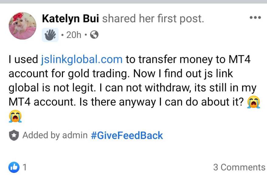 A customer cannot withdraw her deposit from her MT4 account of JS Global. She found out this broker is a scam. Others please stay away from this scam broker.