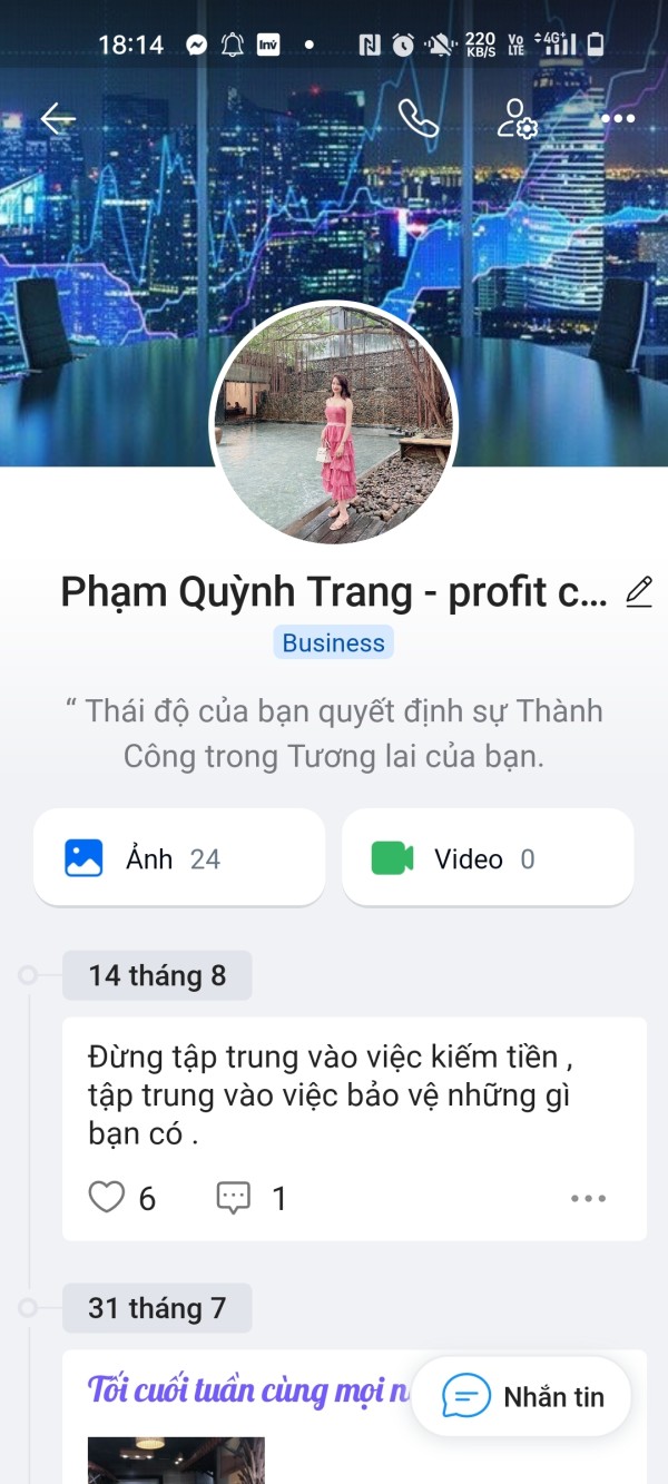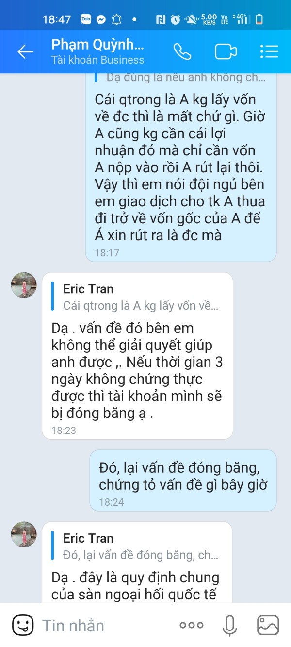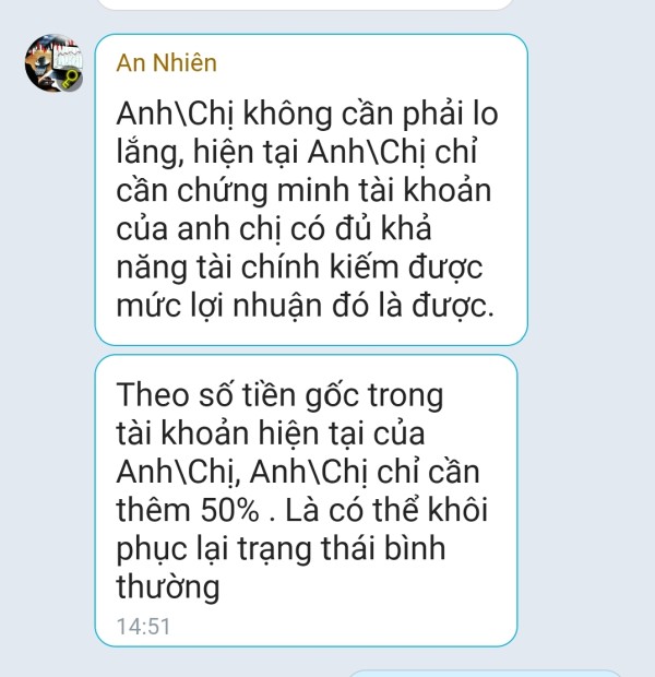 họ có rất nhiều chim mồi đi săn, để những nguời đầu tư mới như chúng tôi sập bẩy, họ tạo ra cái giao dịch nhất quán với phuơng châm vốn càng cao lợi nhuận càng nhiều, đến khi thấy chúng tôi không còn vốn để thêm vào thì họ tạo ra 1 giao dịch với lợi nhuận cao hơn tiền vốn rồi bắt chúng tôi nạp thêm tiền để chứng minh tài khoản nếu không sẽ khóa tk, bằng phuơng thức này tôi đã bị họ lừa mất đi hơn 4000 đô là. hiện tại tôi kg thể liên lạc đc với ai trong số họ vì họ đã chặn hết mọi thông tin