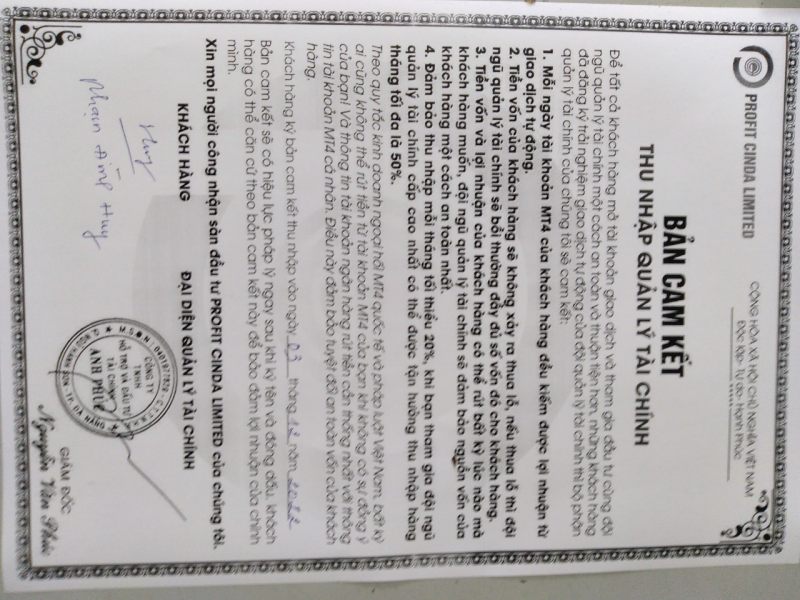 đề nghị sàn giao dich PROFIT CINDA LIMITED chuyển tiền bồi thường cho tôi, sàn đã thực hiện không đúng cam kết và hợp đồng đã ký; sàn đã khóa tài khoản của tôi, tôi đã làm lệnh rút tiền ( thiết lập thành thành ). nhưng sàn không chuyển tiền cho tôi. ( rút tiền 6k USD , nhưng k chuyển tiền cho tôi ). đề nghị các sàn khác hỗ trợ giúp đở và