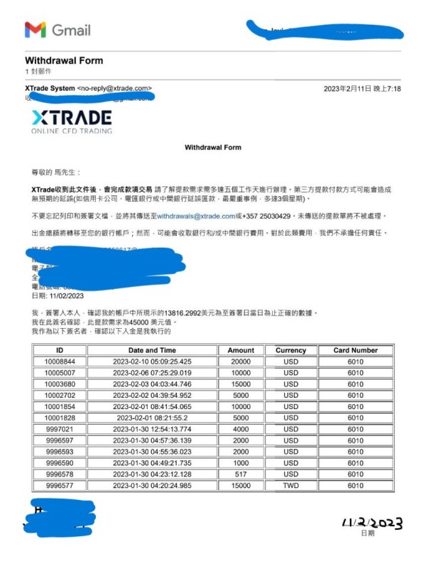 該平臺一直不斷誘導消費者以入金致贈50%獎金之誘因,不斷挹注資金至該平臺,辦理出金申請時又以交易量不足為由拒絕本人提出出金申請,還保證只要將交易量沖到一定的高度就可領回之前挹注的本金45000USD,業務員要我直接在交易平臺操作US/Gold下750USD,us-tech下150USD,同時賣出和買入,採取對沖才能平衡虧損金額,懂得操作投資的朋友應該非常清楚,業務員不能指導投資者進行投資交易,此舉儼然違反法律,造成本人嚴重虧損,目前帳戶內金額僅剩10501USD,本人請求讓此事公諸於世,就算無法拿回個人資金也要提醒大家不要被Xtrade 交易平臺所騙。