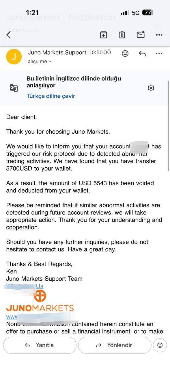 I was victimized I am sharing my experience with Juno Markets to warn other traders. An amount of $5,700 USD was removed from my MetaTrader account without any clear explanation. I contacted their support team multiple times, but I did not receive any transparent or satisfactory response. There was no prior warning, no detailed justification, and no clear reference to any violation of terms. This raises serious concerns about the safety of funds and the reliability of this broker. All transaction records and evidence are available on my side. If this issue is not resolved and my funds are not returned, I will continue to escalate this matter through all available legal and public channels.