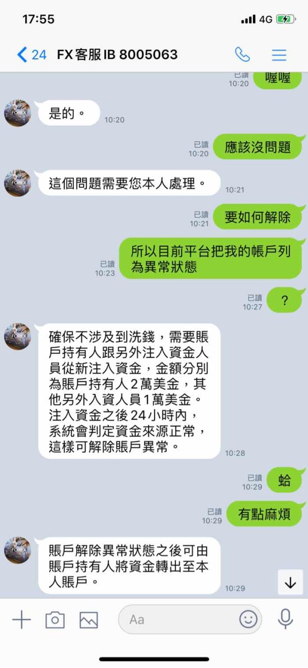 偶然間使用了交友軟體認識一名異性,聊著聊著秀出它的期貨操作成果,但我沒什麼興趣,後來它用各種方法要我去創STPL帳號、入金,想說小額,不疑有他,我就依照客服的提供的帳戶及指示,去入了1萬臺幣,它轉給我2萬臺幣,因此我的STPL帳號內合計3萬塊臺幣(約1000元美金),幾天後STPL這家交易平台寄了封電子郵件過來,稱我的帳戶內有兩筆不同資金,涉嫌洗錢,若沒解除要將此案送去管轄司法單位調查,要我向券商平台客服聯繫,於是向客服人員「FX客服IB8005063」詢問這是怎麼回事,客服表示要我72小時內再入金2萬美金(約臺幣60萬元)、它人要再入金1萬美金,才可以將帳號解除異常狀態,我想了老半天,我向客服人員要入金解除異常的法源依據以及你平台的上級單位,講不出個所以然