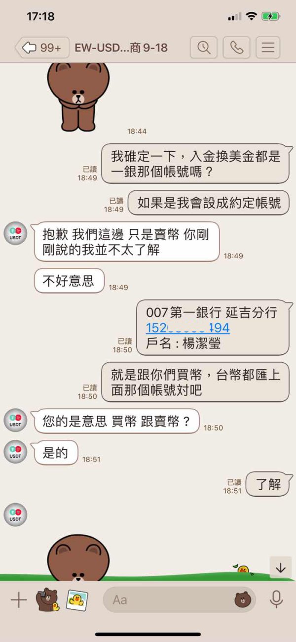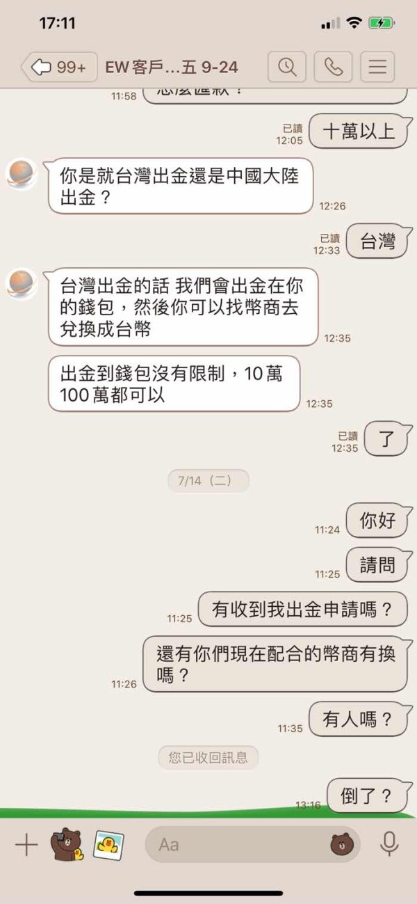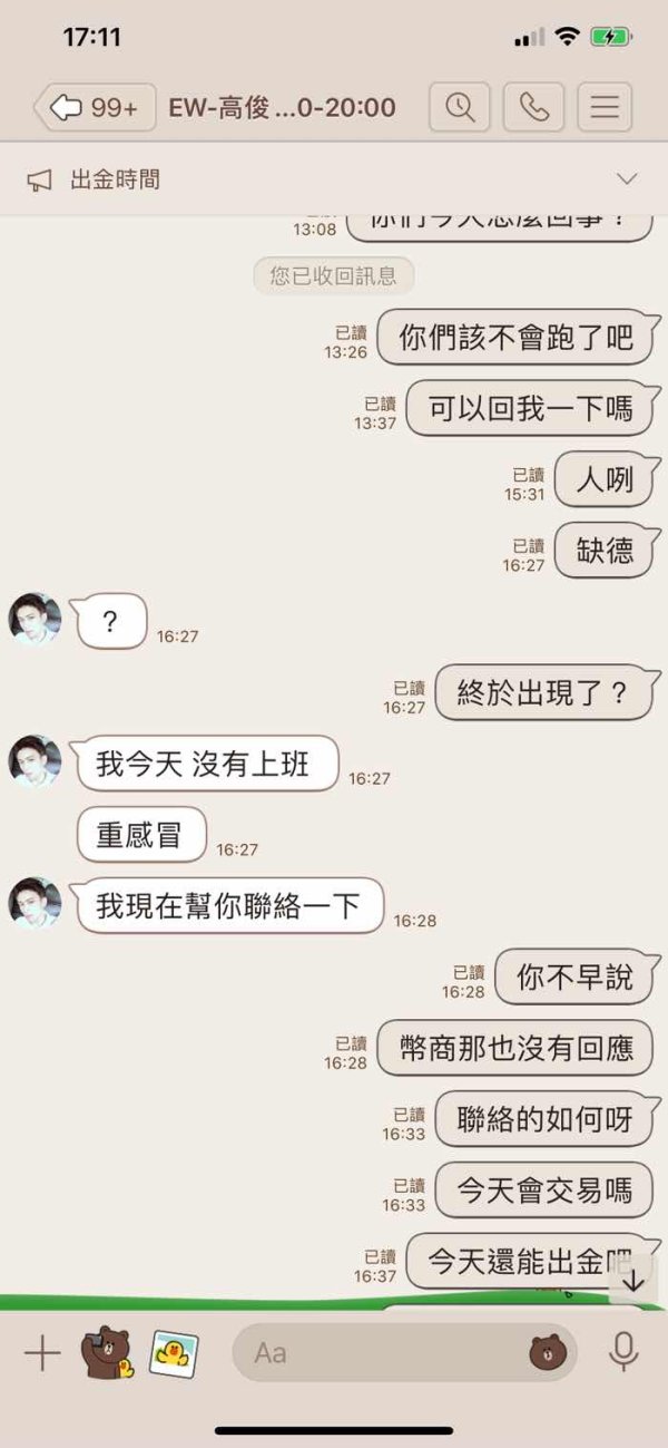 我是在奇摩的廣告看到,會先加入一個自稱顧問人員詢問你投資概況,之後推薦一個業務窗口專門服務你,一開始有試過小額出金正常,然後業務人員會用短、中長線騙人入金投資,還說一次投3萬美元可送3000美元,3萬美之下只操作短線,短線天天操作給你看天天獲利在MT4上,保證最少每月20%,吸引你再入金投中、長缐。要出金時就已讀不回!不要再有人受騙!帳上有獲利時要出金業務窗口就説有業績壓力,可否下個月10號左右領,等到了下個月10號到了就已讀不回!不要再有人受騙!分享的照片有(業務人員、幣商、客服、MT4帳上餘額吃不到幹)請大家注意不要再有人受害了!