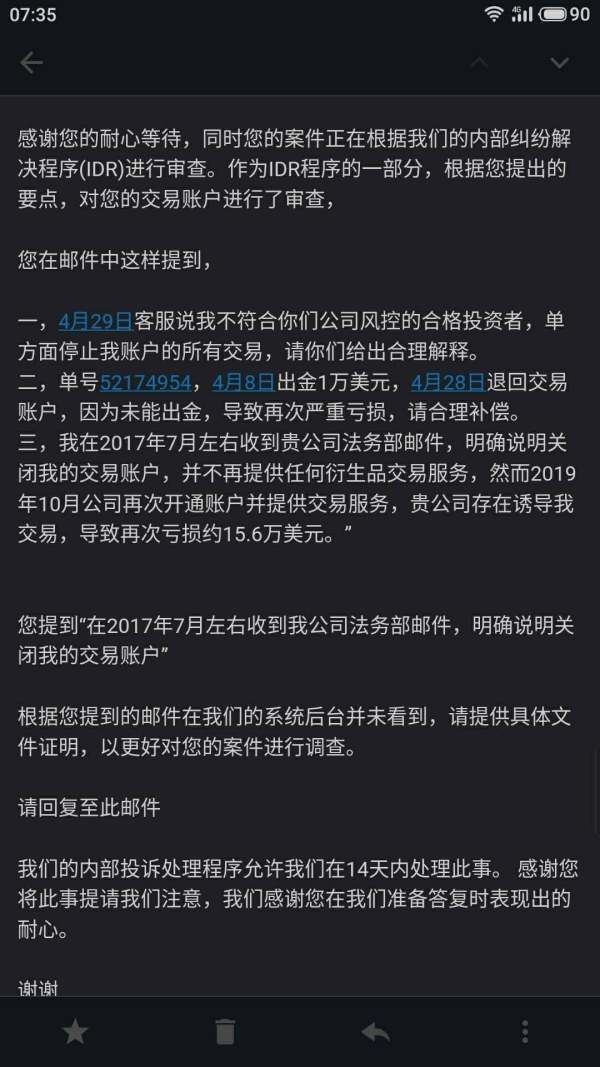 一,4月29日客服说我不符合你们公司风控的合格投资者,单方面停止我账户的所有交易,至今未给出解释。 二,单号52174954,4月8日出金1万美元,4月28日退回交易账户,因为未能出金,导致再次严重亏损。 三,我在2017年7月左右收到贵公司法务部邮件,明确说明关闭我的交易账户,并不再提供任何衍生品交易服务,然而2019年10月公司再次开通账户并提供交易服务,贵公司存在诱导我交易,导致再次亏损约15.6万美元。 四,5月8号登陆后台发现多了472783和448716两个交易账号,5月13日除了我的联系电话,多出来联系方式1312****789,此电话不是我的,我也不认识,随意修改客户资料。