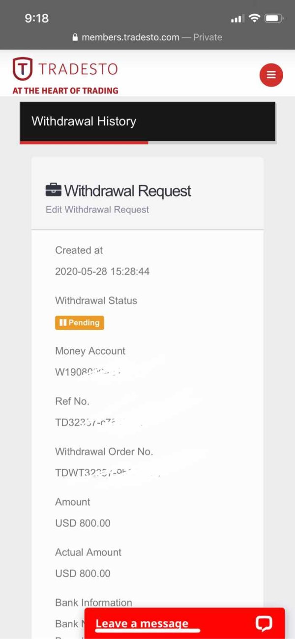 28/5/2020 出金提交已经1个多月了 Tradesto还在审核 不知道到底他的account team有没有在工作。发电子邮件询问一直得到一样的回复 说明正在审核。。。到底出金要花多长时间。。。