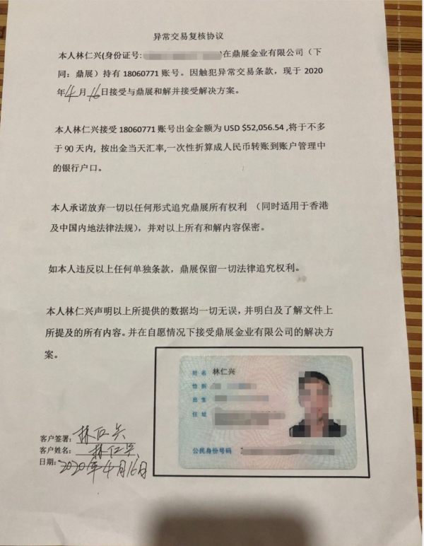 本人林仁兴,持有鼎展金业的账户:18060771,由于疫情的影响,使原本不富裕的家庭雪上加霜,所以贷款了三四十万资金在鼎展金业公司操作,经过了本人的一番神操作之后,本人在鼎展金业公司盈利了六万美金左右,然后本人就想出金六万美金左右,没想到,鼎展公司是个无赖公司,不让我出金,同时也把我的本金扣押在那边,之后又逼我签下那份协议书,这份协议书对我而言,毫无公平意义可言,但是没办法,因为本金业被扣押在鼎展的平台上面,本人只能含着泪去打印那份毫无公平可言的协议书。而后鼎展刻意扣押本金37万90天。截止7月28日为止,现在鼎展金业把本金已经全部汇到我的账户上面来,但是我鼎展金业账户上面还有61667美金,鼎展金业无缘无故把我61667美金在平台上面出金,又没汇到我的银行卡上