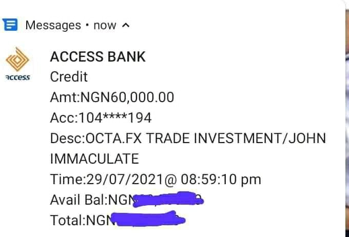 STAY AWAY FROM SOME PEOPLE THAT WILL BE FOLLOWING YOU AND CONVINCING YOU TO INVEST WITH OCTAFX BECAUSE IM A VICTIM SOME ONE CHAT ME UP ON TELEGRAM CLAIMING TO BE AN OCTAFX AGENT HE ASK ME TO INVEST 30, 000 AND I WILL GET 60, 000 IN RETURN SO I AGREED AND TRUST HIM I BROW MONEY FROM MY ELDER BROTHER AND INVEST AFTER SOME MINUTES I SEND THE MONEY TO HIM FOR THE INVESTMENT PACKAGES LATER ON HE SEND ME AN FAKE ALERT OF 60,000 WHICH IS ON THE SCREENSHOT AND BLOCKED MY NUMBER SO PLEASE STAY AWAY.