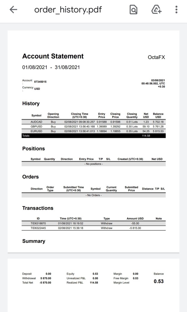 So i deposited 5755$ for trading into octafx. withdrew 55$ , i received that. i felt ok with trading now. traded with $5700, opened 3 trades gained around 115$ profit. when i go to withdraw the 5815$ amount, after a hour or so, they give a confirmation email stating that your withdrawal is complete..but even after 12+ hours, i have not received 5815$ in my crypto ETH wallet. i shall be attaching my order history, withdrawal status and etherscan wallet information.