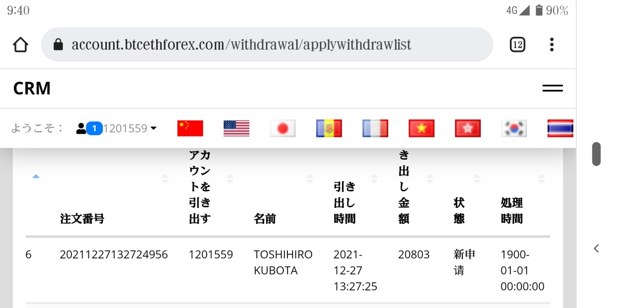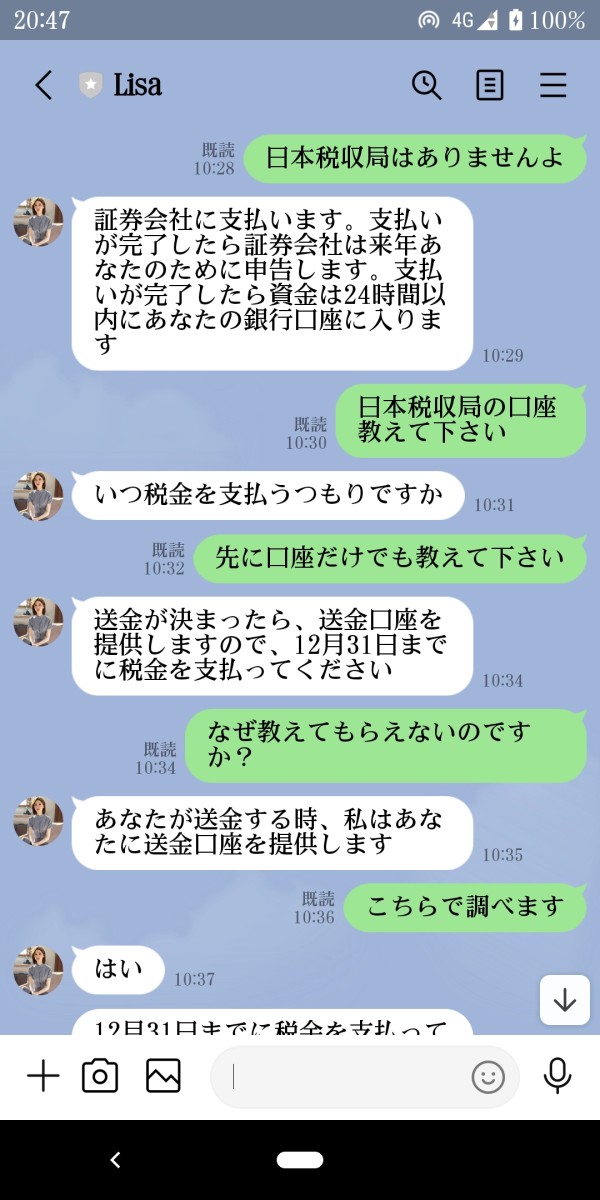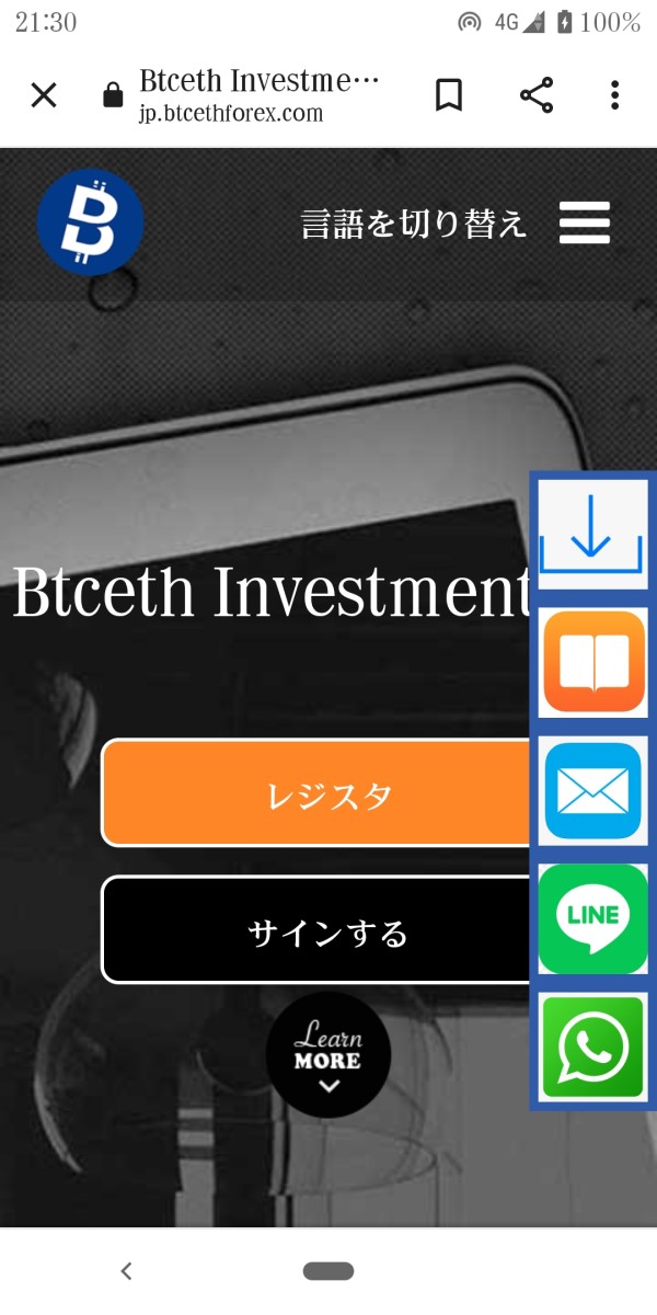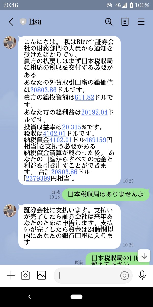 SNSより 知り合い 韓国ハーフの女性で 外貨投資の取引を 勧められ 押し付けるように 事を勧め 口座開設 MT5のダウンロードをして そのマネージャーを紹介されて 作業は完了しました 最初にあった 韓国ハーフの女性は MT5アプリを利用する 取引作業の誘導 マネージャーは 入出金の管理 取引作業の勝率はほぼ 100% 出金申請を マネージャーに 提出すると 写真にもありますが 高額な税金請求を 収めないと 出金できません と言われました 日本税収局や日本の弁護士は国際外貨管理条例を全然知らない。と罵声を言われました 韓国ハーフの女性 Btceth Investment Ltdを名乗るマネージャーは すべて ラインとやり取りです Btceth Investment Ltdのサイトの 右側に メールやライン チャットなど ありますが ラインもアジア系の女性追加です その他の証券会社のサイト トップ画面が 似てるサイトも 見かけました