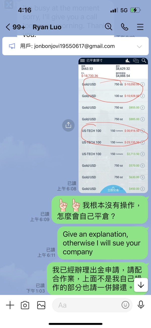这平台从来没有主动告知客户应注意的投资理财风险,客户已提出退款申请,该名业务员却滥用客户基础信任感导致投资失利,保证金低于水平将导致投资标的自动平仓却不主动说明,只见电邮通知,这些都是废话,最重要的是这公司的业务员擅自指导投资者进行操作,事后却不肯负担任何责任,甚至还告知投资者说你去告啊!你告不赢的!真是可恶至极