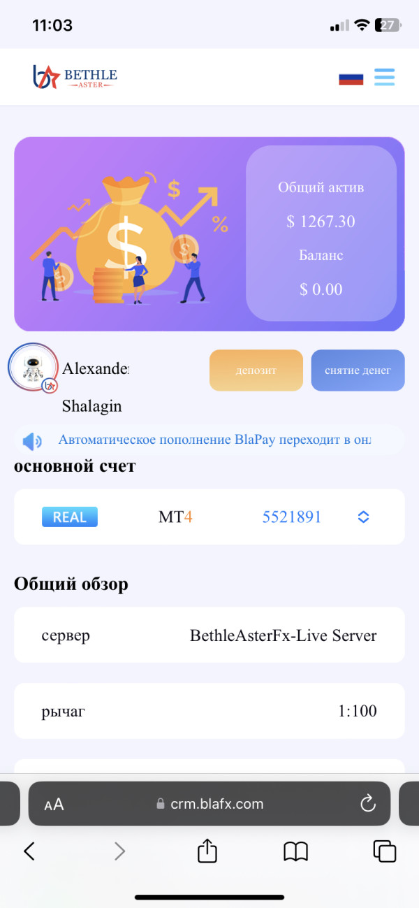 здравствуйте, меня зовут Александр я являюсь клиентом BlaFX на протяжении 4 месяцев. вношу свои деньги для увеличения своего капитала. сейчас же не могу вывести свои средства в течении 3 дней. пишу в тех поддержку, тех поддержка отвечает но каждый раз по разному и не какой конкретной информации до сегодняшнего дня не было. сегодня тех поддержка заявила что с 18 числа по 25 число у них акция 100% к депозиту и из-за этого не получаеться вывести свои средства. я им пишу о том что я поставил свои средства на Вывод 17 числа утром и до сих пор мне не приходят деньги на мой счёт. я уверен что компания хочет кинуть своих инвесторов. помогите пожалуйста вернуть мне мои деньги, я вас очень прошу. с уважением Александр