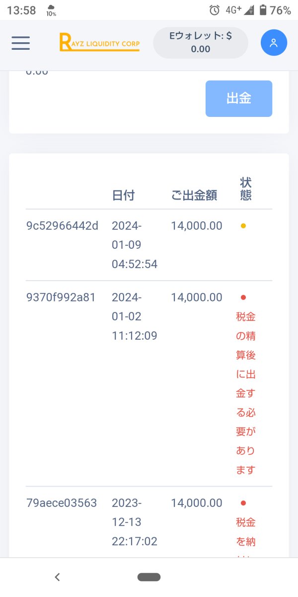 昨年9月中旬にSMS広告よりLineグループの笹山金融塾に案内され、口座開設をRayz Liquidity Corpを指定されました。FX取引自体初めてですが、AI自動取引なので心配ないとの事でMT5を使用し開始。塾の内容は笹山先生が毎日の株式公開状況やローソク足チャートからの移動平均線等の分析系の講義。FX初心者としてはとても有難く、9月に200万円入金してから、AI自動取引も毎日MT5上で利益も出ていましたので、アシスタントの成田さんやグループメンバーの挑発に乗り10月に更に100万円追加入金し、1度350$の出金確認しましたが、スムーズに私の口座に着金出来き、その後もAI自動取引は毎日利益を出していました。そして12月に入り、Rayz社は年末に決算で投資金額に対する利益の20%運営費が必要と、入塾時から何も説明なしに出金前に要求してきました。余剰金額をAI自動取引にすべて入金しており、70数万円は周りの人達から出金して返すと借金し、指定口座に運営費を払い、いざ取り敢えず14,000$出金手続きしましたが、Rayz Liquidity Corpの社員?から今度はRayz社への納税が先だと言い出し、出金に至りません。それから何度か脅されましたが、無言で我慢しながら警察か弁護士に相談思案中。ところが12月終わりに笹山金融塾グループは私を置いてまた新たなグループを作ったと思われます。それなら私は退塾し、14,000$と残高を返金して欲しいです。