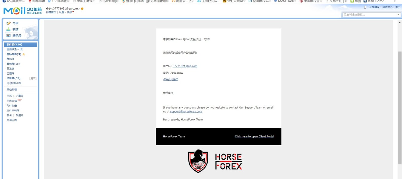 这平台非常黑,一入金赚点钱,就无法登陆,然后问官网客服,客服叫找业务经理,业务经理直接失联, 账号: 588809778 主密码: 0b0cd8qP 投资人密码:b4b15f8F 服务器: Horse Forex MT4 Live
