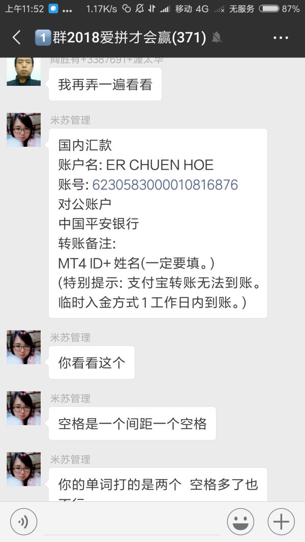 我在2018年4月通过微信好友渥太华(微信号:zhangzhen180)的诱骗下到名为寰星国际(www.fxmiso.com)的外汇平台做交易,该平台宣称有正规资质,国家许可的正规公司。群主渥太华将我拉入微信群中,每天在微信群里对我们进行洗脑,让我入金,另外还多次诱骗我跟随所谓的外汇分析师一起做交易,并引诱我加仓,重仓频繁交易,在我资金被榨干之后将我踢出了他们的微信群,并且封了我的交易账号。YY直播间7位老师喊单带我们进行的外汇短线交易也是类似于二元期权猜跌涨的微交易,国家已经将二元期权列为赌博。 后来经多方查证,我的资金并未投入到国际外汇流通盘,而是通过中国银联、银盈通支付有限公司、平安银行(平安银行转到一个叫马嘉儿跟ER CHUEN HOE 私人账户),YY直播间7位老师轮流讲课喊单导致投资者亏损大量资金