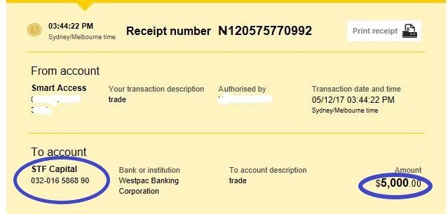 2017年11月21日我与STF Capital盛兴远大资本,(现网址www.stftradinggroup.com,原网址已关闭)签订合同成为该公司的交易员(后来得知该公司是以招聘之名实则为发展客户),通过个人和公司各出资50%成为该公司交易员,约定我获得或承担50%的盈利或损失,即我出5000澳元,公司再给我配资5000澳元,获得一个总交易金额为10000澳元的账户(1308724) 2017年12月5日,我向STF Capital账户(032016586890 Westpac Banking Corporation)转账5000澳元完成入金,之后陆续有交易,我于2019年5月17日平仓所有订单,当时账户余额为9555,之后无新交易。6月18日我登录账号时,发现无法登录后,然后我通过微信和邮件联系对方,但一直没有得到回复。7月3号我发邮件投诉,他们于7月9号给我回复,承诺在8月27日前分5次给我出金,但是截至目前,只出金了2次共2000澳币,还有2778澳币未完成出金。这个公司现在仍然在智联招聘等各大网站发布招聘信息玩聘销套路,各位千万不要再上当了!