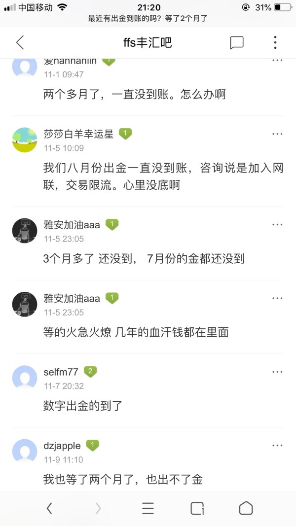 FFS7月出金至今未到账,FFS百度贴吧和外汇110很多客户在咨询,平台客服只是回复请耐心等待。