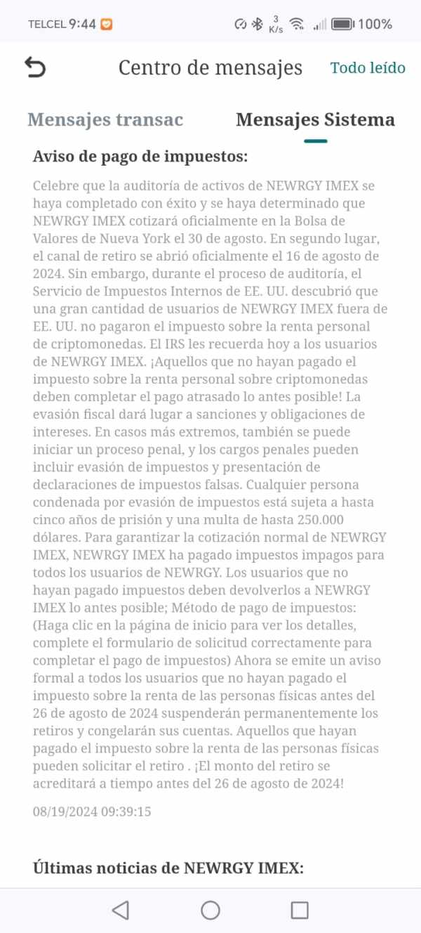 el dia de hoy newrgy acaba de solicitar el pago de un supuesto impuesto por cada uno de los usuarios y de no devolver ese impuesto la cuenta de cada usuario sera eliminada. esto es fraude inducido