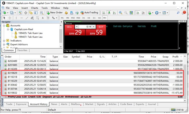黑平台,小心!! 输钱就正常交易,盈钱就说交易不正常。 2025年5月20,申请出金18,523.49 美元,Capital.com 拒绝出金。 MT4 账户199435、199437 已经扣钱,但没有汇出金额。