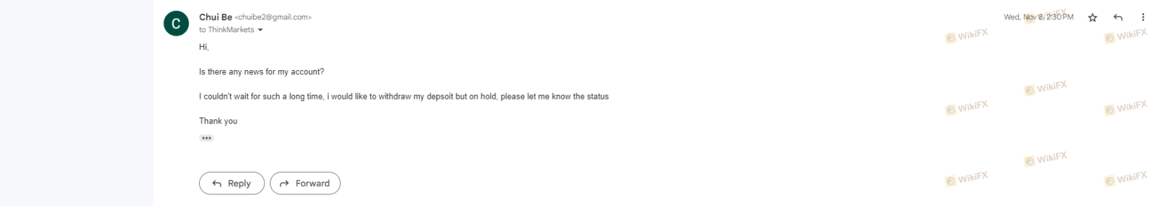 ThinkMarketsaus böswilliger Absicht kein Geld abheben kann. Es erfolgt keine Antwort auf die E-Mail. Ich habe den Kundendienst/verschiedene Abteilungen kontaktiert, aber keine Antwort bezüglich der Auszahlungsmodalitäten erhalten. Das hoffe ich einfach ThinkMarkets kann ganz normal Geld abheben.