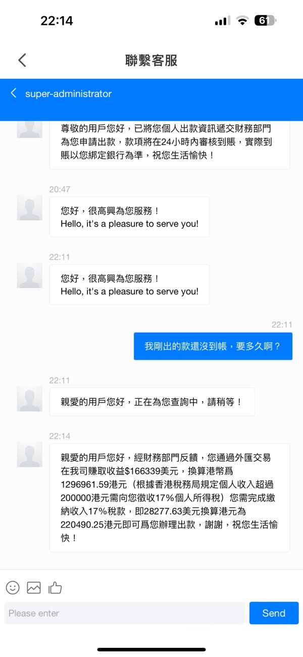 Previously, it was said that after completing the rebate activity and reaching three times the trading volume, you can freely withdraw funds. However, after completing the withdrawal requirements, it was said that a 20% tax payment is required. Later, it was received a notification from the police that the merchant account provided to him is under investigation for fraud. After checking, all the accounts provided by the platform are reported to be high-risk and suspicious accounts.