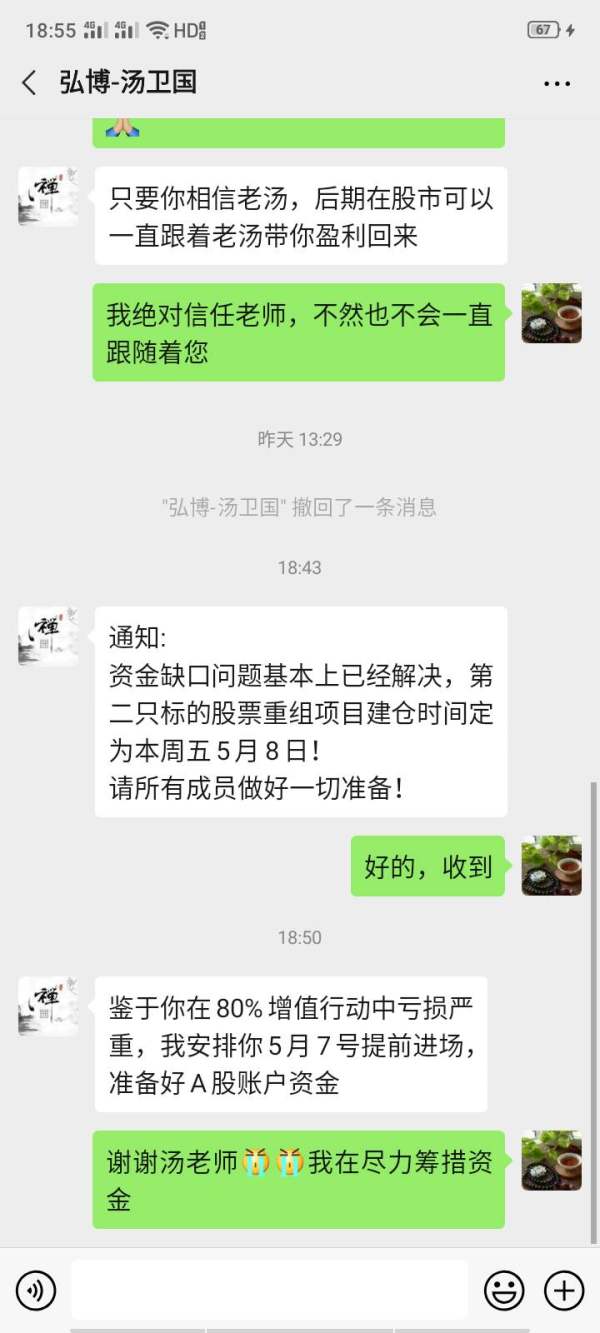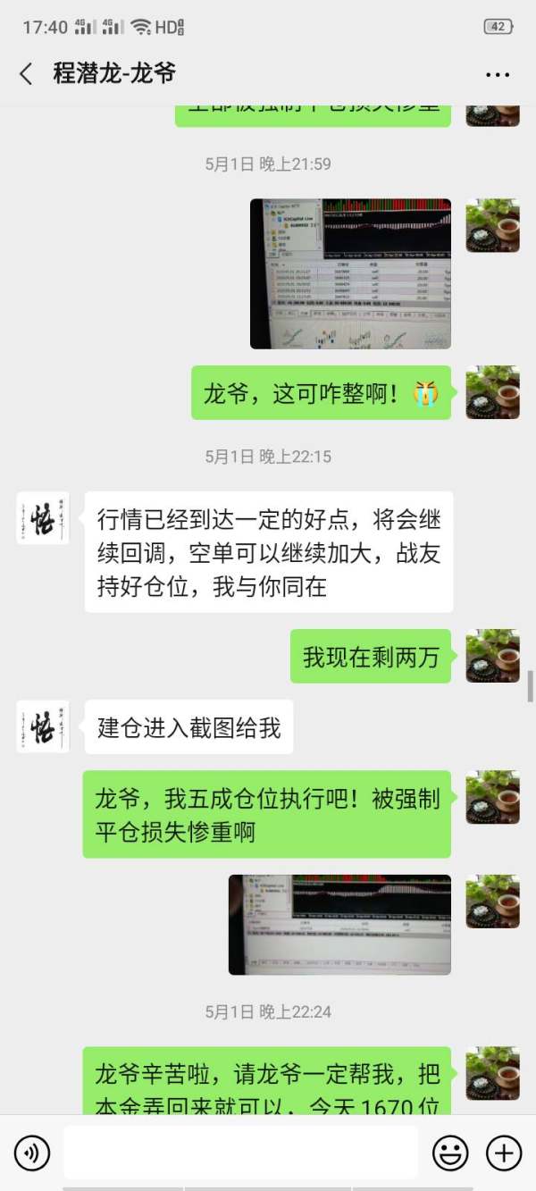 三月份的一天在家百无聊赖,于是上网,浏览到一篇介绍一个传奇散户人物的文章,文章最下方还有这个散户人物的微信号,于是抱着一种好奇心加了这个微信号。这个老师自称汤卫国,微信名字叫弘博汤卫国,开始这位老师非常客气,说只要是股市上的问题都可以咨询他,后来还拉我进了一个微信群,再后来他说因为疫情 他作为一名退隐股市的人也要做一些事情出来,成立了一个组织叫股市爱国会,该组织的宗旨和目的就是带领所有股市爱国会成员在A股市场获利,然后大家拿着获利的资金共同去帮助入股因为疫情而受困的个别受考察企业,带领爱国会成员为国为民做一些力所能及的事情,然后周一到周五基本每天三场直播会议,不断的培训学习,并偶尔有一手两手的交易,说目的就是把所有爱国会成员训练成合格操盘手,做到令行禁止。期间除了汤卫国,还有龙爷程潜龙,林总教头,K先生,不断的培训股票知识和操盘技术。最后经过汤司令和龙爷的一场比拼,说为了我们爱国会操盘资金达到第二只标的的目标,最终带领大家到这个伦敦金市场进行操作,很多人都非常信任他们,我也通过他们介绍的开户总监在这个平台入金四十五万,五一节在龙爷程潜龙的指令带领下,最终爆仓,被喊单诈骗,发文警醒。