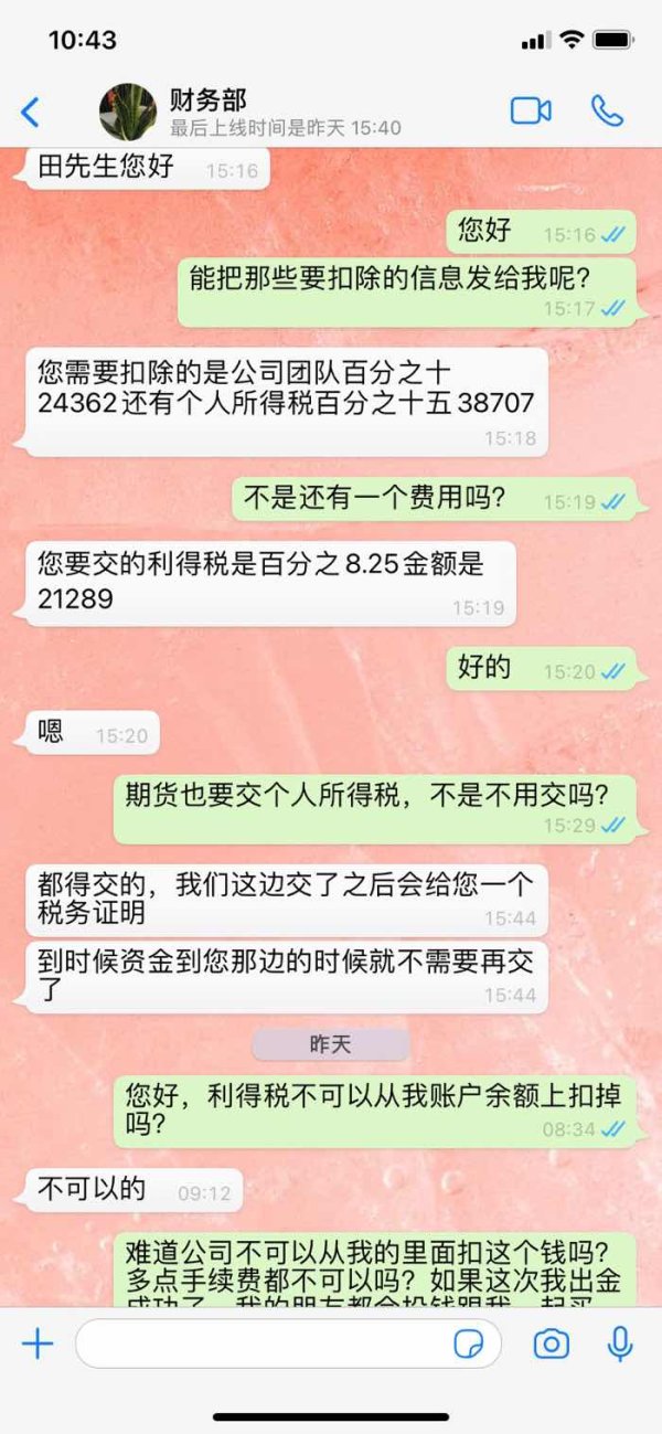 大家注意,这家公司是一个骗子公司,只要入金以后就会对你不管不问,一直就是找你要钱,他们在电脑上操作,让你挣钱,然后出金的时候就要交几种手续费,不交钱,就不出金,曝光以后为什么就是没有人管呢?