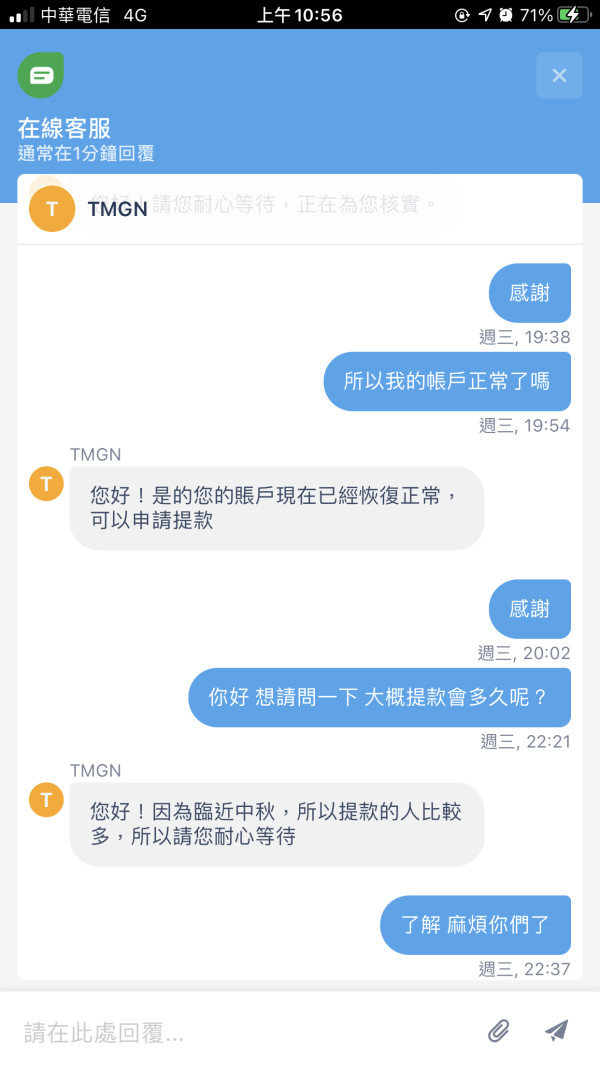 首先我的帳戶被告知被凍結,因為要出金要繳保證金,繳完保證金後可以申請提領,但都是各種理由拖,有詢問用什麼方式最快出金要我加入貴賓通道,目前沒有再入金加入貴賓通道,就不知道出金會多久