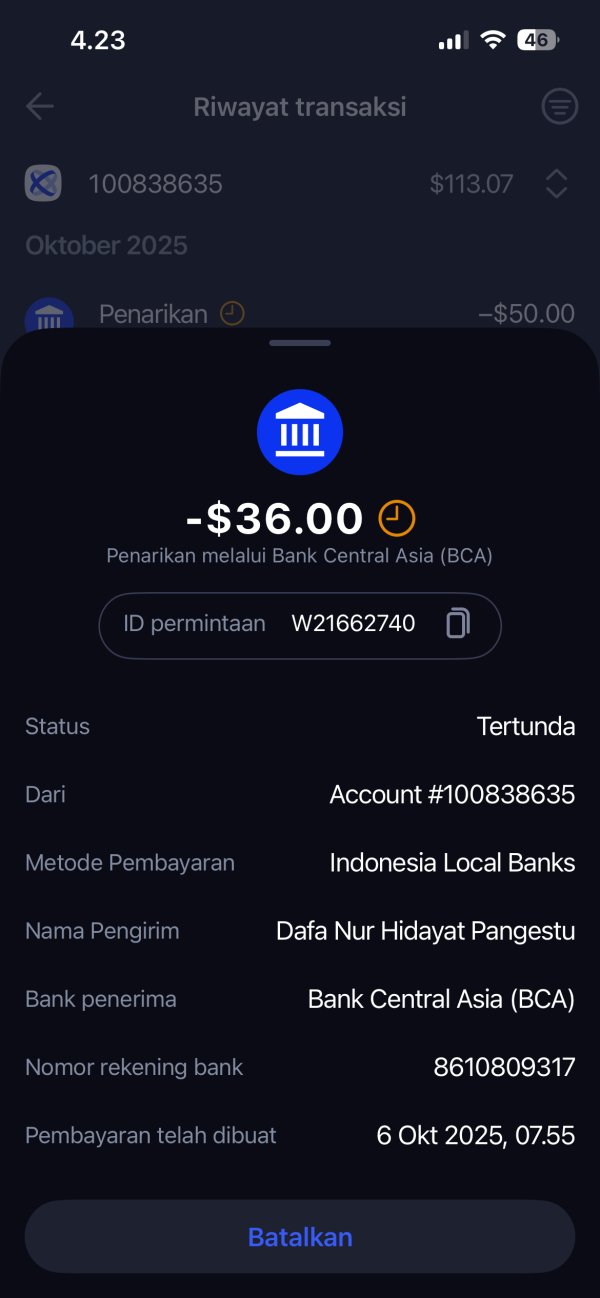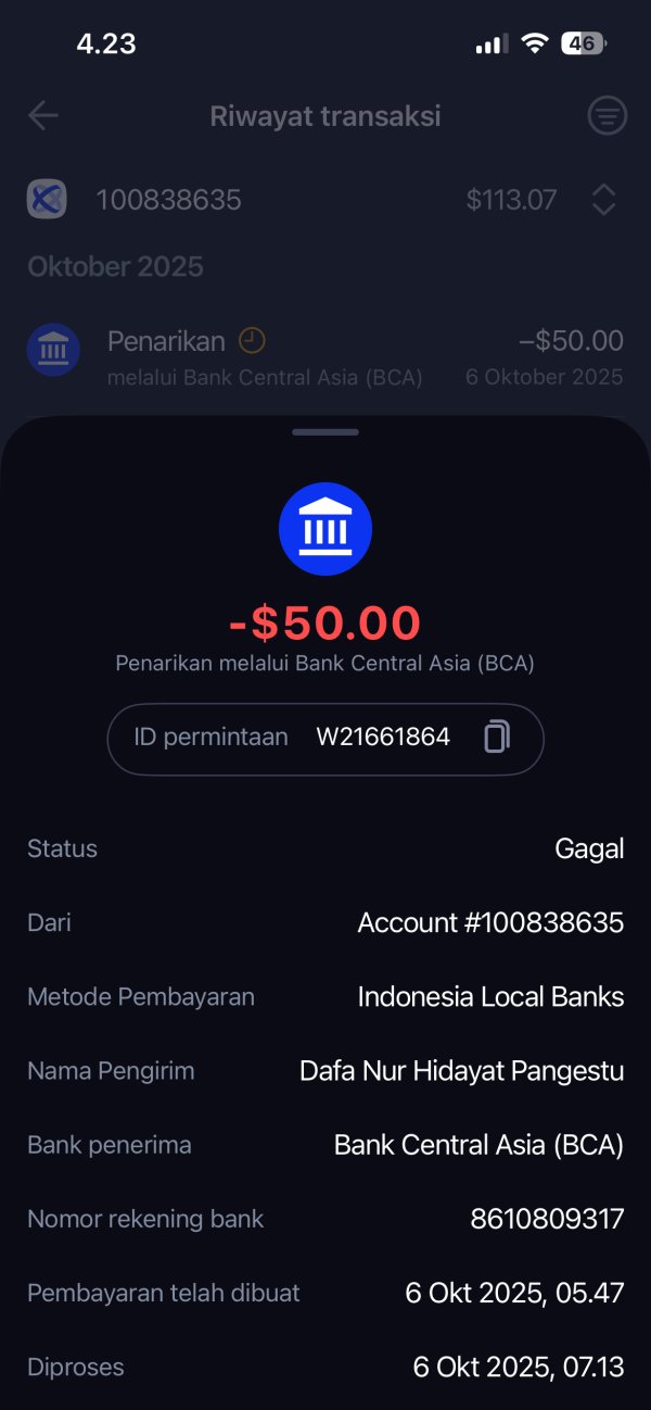 saya sudah menunggu lama untuk menarik dana saya yang masih ada di octa fx,saya sudah menunggu berhari-hari namun belom masuk juga dana saya, sampe saya coba lagi tadi pagi namun sampe sekarang belom bisa di tarik dana saya