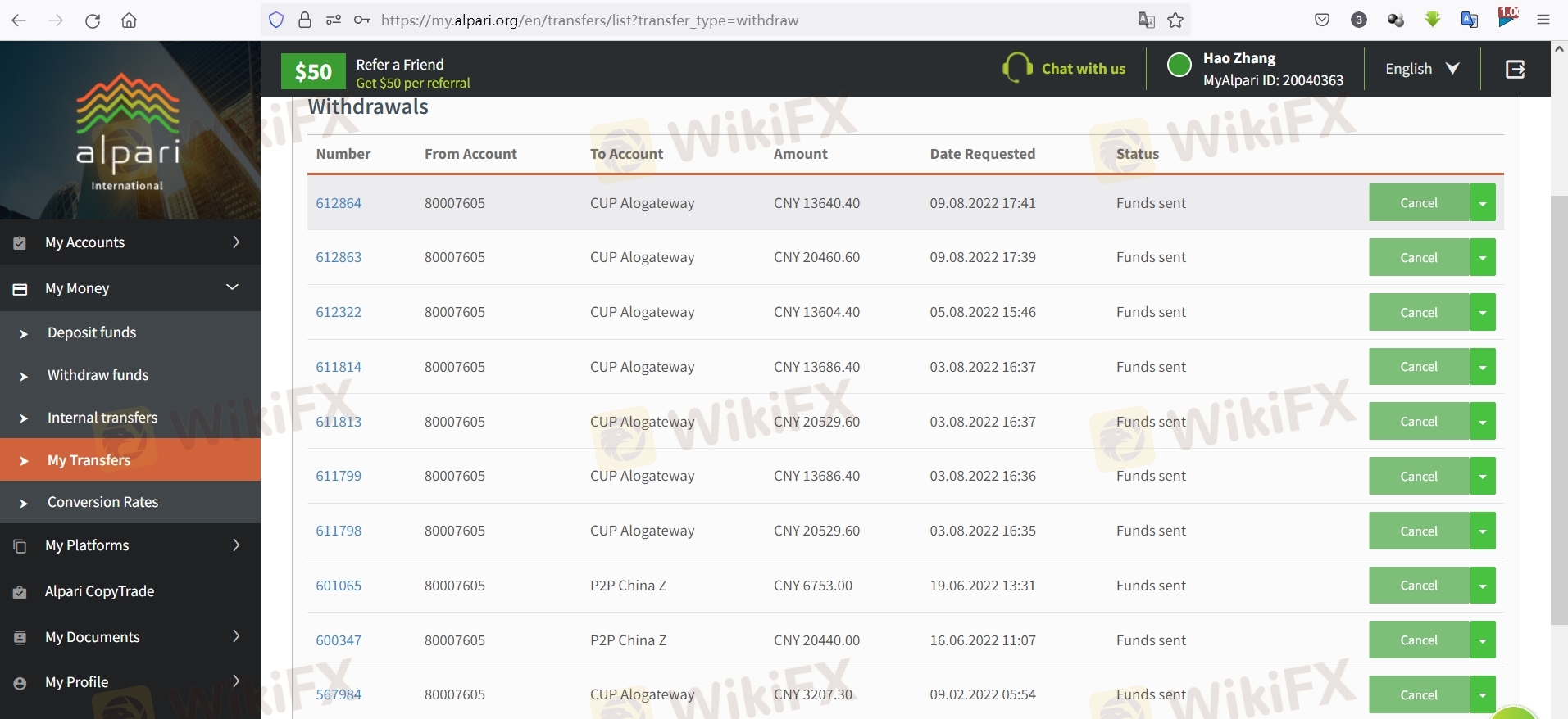 Thank you for contacting us. In reference to HAO ZHANG's problem with withdrawal, we have told the financial department immediately to contact the payment provider for checking out the amount of money withdrawn. According to a few days following up by the department, we find that the money was returned from the payment provider's system to your Alpari account on August 17, and you resubmitted a withdrawal application on the same day. We are deeply sorry for the inconvenience and concerns caused. If you have any problems, please feel free to reach out to us. Thank you for your support to Alpari. We hope that our service is helpful and will better serve you.