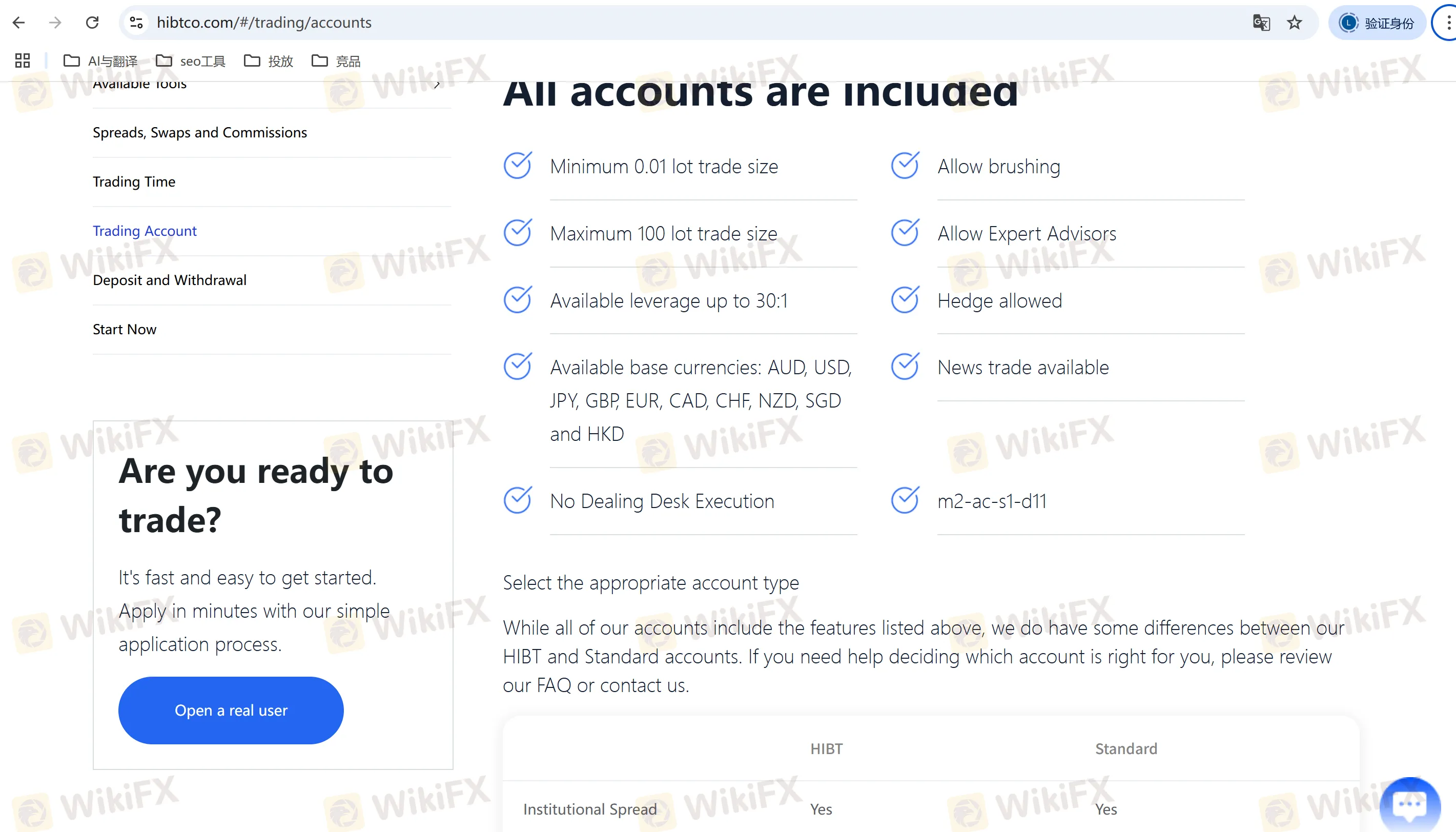 A4: HIBT charges a commission of 7 AUD per 100,000 transactions for the HIBT account, while the Standard account is commission-free. The spreads start from 0.0 pips.