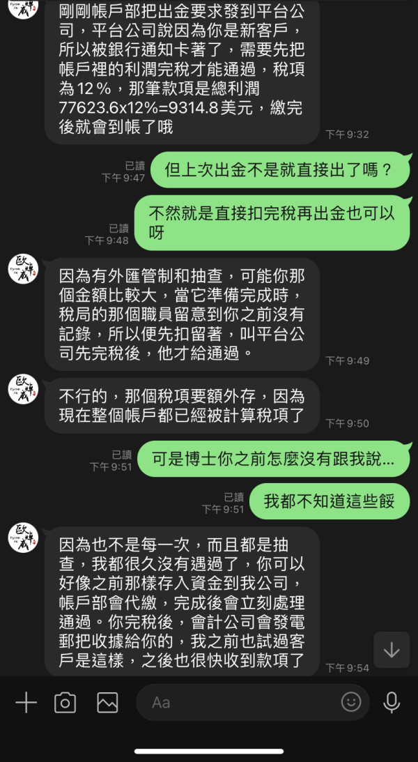 剛開始接觸是因為在交友軟體認識的人,他介紹一位稱作是交易總監的歐博士給我,說可以幫忙進行外匯交易,然后就用了他們公司提供的MT4平台交易,最初那位歐博士說要最低本金1000美才能開始進行交易,所以我當時就入了1009美進去,當時交易了一週,我就嘗試出金,當時只出了160美,有成功取出;之後博士在一天問我要不要參加平台的活動,說儲值50000會送20000美,但我沒那麼多錢,所以博士就說可以先幫我申請,之後再補回就好,我就答應了,另一位交友軟體認識的那位女生,也說可以先出39000美,剩下的請我補足,我就依照他們說的去做,然后又入了11004美進去,問了博士說能否提領,他說可以,結果提領申請出去後,兩天都沒消息,我就問了博士,結果他說因為我申請出金的金額過大(我申請出金70000美)所以被稅務局查到,說要繳納利潤12%的稅(一共是9314.8美)後才能出金…