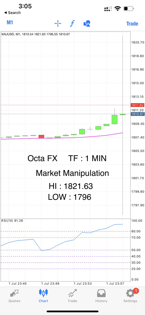 It all happened in 5 seconds the price of XAUUSD went up to 1821 and then go down to 1797 and closed to 1810 killing both buy and sell postion Making alot of people MC