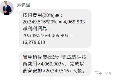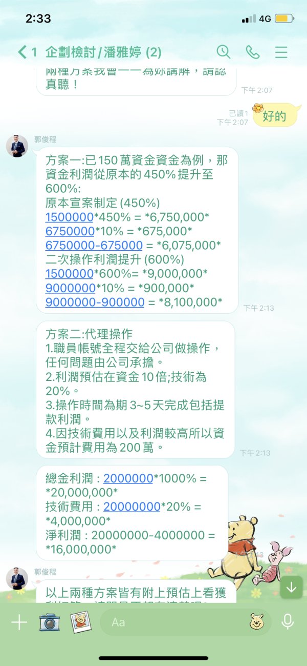 在fb社團找兼職認識到介紹人,加入line群組約300多人幫公司操作USOIL美國原油下單,1周後公告企劃讓職員投資金換成USTD幣匯款給公司,主管協助提供數據賺取盈利,利潤5%支付技術費、5%捐助慈善團體,想著可賺錢也可做善事,群組中有很多職員都成功領到錢也分享心得,自己鬼迷心竅也投了100萬。 但操作過程失敗了,很緊張想把辛苦錢拿回詢問有什麼辦法!主管告知可請公司代理操作但需投入的資金要200萬,但能領到更高的利潤!但沒有那麼多錢聽著主管教導用借貸來賺回資金又投了200萬。 通知操作成功想著可領回資金還債,但告知要先繳總利潤20%,400多萬的技術費才能領盈利,但沒有那麼多錢,一直跟公司請求提供其他辦法讓我領錢。 後續願意讓我有多少資金先繳技術費,同意繳款當天就可以匯款給我,原本說要先繳30萬但只有10萬詢問可否讓我領相對等的盈利還款,主管告知可以先領款,但一天過都沒有匯款,詢問後又反悔說公司一開始是同意先已30萬繳納才能領盈利。