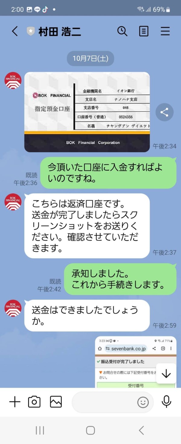 まつおしげとという方が先生のLINEグループにて BOKFのFXアプリから取り引きするよう薦められ、BOK Financial日本支社の村田浩二という方から取り引き指示をもらって取り引きしていました。その後、原油取り引きを薦められ証拠金68ドルで出来ると言われ購入。しかし決済日になり現金決済をしないといけないと言われ6,800ドル必要だと。しかし、お金がないと言ったら融資しますと言って証拠金に着金されました。 その後、利益分を出金しようとしたら融資分を現金で返済しないと出金出来ないと言われ、友人達に借りて何とか6,800ドル(96万円)を返済しました。返済すればいつでも出金出来ると言うので出金申請した所、今度は税金を現金で支払わないと出金出来ないと言われ出金拒否されました。 友人達に借りた分だけでも返金してほしいです。 助けて下さい!