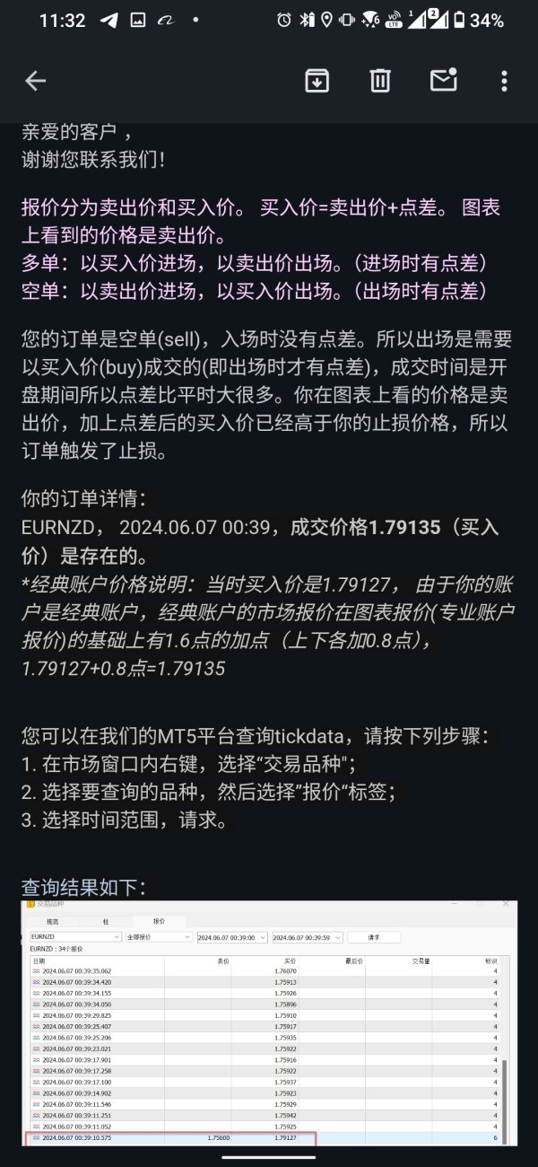 在2024年6月4日 我在货币对EURNZD 的位置1.76035做了 sell,因为个人是用H1/H4去用自己不专业的分析去做单 第二天6月5日 单子是往盈利的方向走 没啥变化 所以就在第二个户口也做单了,户口内200美金 下单0.10 sell 在位置1.76035左右的位置 就在第三天(6月6日)起床的时候看了手机 结果爆了 我设置sl 1.76700 但是我看我单子的时候 却是sl在1.79135 如以下图片 我整个人都干懵了。 我就去寻找客服去询问这件事,客服邮件来十几次了 同样的话术同样的歪理告诉我:开盘时间 所以“点差较大” 我在想着点差较大是不是我不够理解,日常点差15内 就6月6日晚上出现了 3000点的夸张点差 然后以下就是我的证明 还有就是他说的点差 好像有点夸张 我需要用H4/D1 的图片才能看到买入跟卖出点 好像有点离谱 所以想要曝光 并且让高人指点 这个事情该怎么样怎么样处理 或者只能认栽