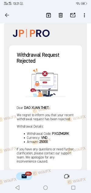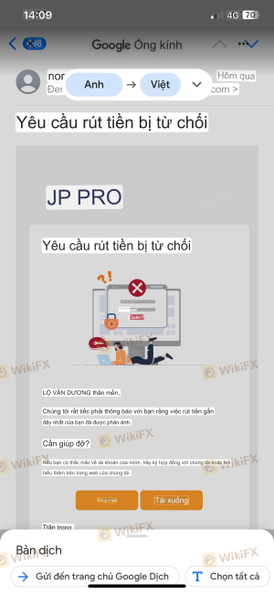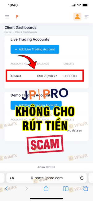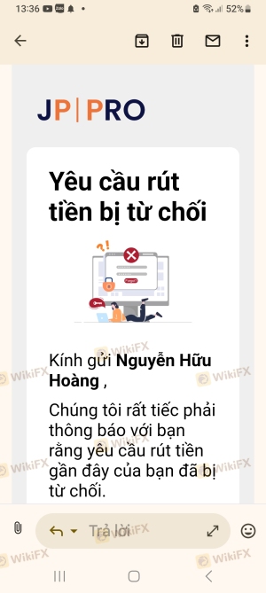 Jprro, jppro.com me ha estafado y se ha apropiado de mi dinero en la cuenta mt5: 401585, el corredor no tiene ética y estoy denunciando esta estafa a la policía y a las instituciones financieras, tanto a nivel internacional como en Vietnam, por el acto de apropiación de dinero, manipulación fraudulenta de precios en mt5 y estafa a los clientes; Para evitar que puedan operar y tener actos deshonestos de apropiación de dinero de los clientes en Vietnam, el corredor canceló intencionalmente las órdenes de retiro cuando realicé un retiro, como por ejemplo, había una orden de retiro de 8000 USD, 25000 USD... el corredor canceló y no permitió el retiro. Permitió que el personal del corredor interfiriera y causara daño a los clientes de trading. Este incidente ha provocado que jppro ya no opere en Vietnam.
