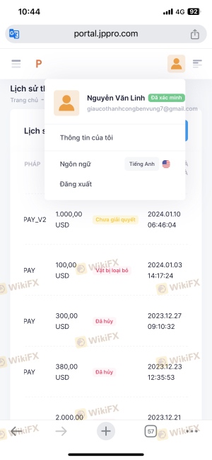 Jppro.com ha estafado y apropiado mi dinero en mi cuenta de mt5: 406105. La plataforma es poco ética. Denuncio esta estafa a la policía, a las instituciones financieras internacionales y en Vietnam por actos de apropiación de dinero, ajuste fraudulento de precios en mt5, engaño a los clientes; Con el fin de dejar de poder operar y tener un comportamiento poco ético de apropiación del dinero de los clientes en Vietnam, el intercambio canceló intencionalmente las órdenes de retiro cuando hice un retiro, como una orden de retiro de 594$, 1135$. . son canceladas y no se permite retirar. Permitir al personal del intercambio interferir para causar daño a los clientes comerciales. Este incidente ha provocado que jppro ya no opere en Vietnam.