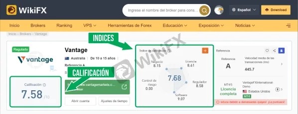 La calificación obtenida por Vantage en WikiFX es de 7.58 / 10.00, ya que, aunque tiene muchísima experiencia en el mercado y excelentes características comerciales, el alto número de exposiciones hacen que su calificación baje un poco.