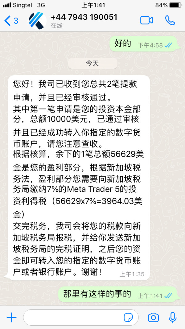 我在这个交易商交易获利了5万多美元、我申请提现也批准了,不过要我先交税了才可以把资金汇给我,这是不是套路呢、不过我是申请两个出款的,一个是申请数字货币1万美元是我网友把我注资的这个1万美元他也收到了,我感觉这个网友是骗我的,剩下56629美元我是申请国际汇款的,该交易商也发邮件跟我说提现已批准了,钱没到账,隔天该交易商客服跟我说要我先申请交税了之后才可以把我的资金汇给我
