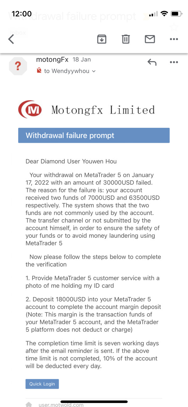 經網友介紹開戶交易,存款及完成晉級活動后卻不能正常取款,取款要求發出后,不斷聯繫客服人員詢問(網址:https://chatlink123.meiqia.cn/widget/standalone.html?eid=3688efeec4f24eb5de57c378409f6e21&language=en)經過20多小時始終未能收到資金,卻收到從motongFx willam0079@crmt4.com 發耒的郵件,我被指涉嫌洗錢,要再次投入18000美元認證自己的帳戶才能出金,不然就要每天扣除帳戶資金10%,(見附件)。黑平台擺明了侵吞客戶資金。致使本人直接資金損失高達十几萬美元。只能在此警示其他投資者不要上當