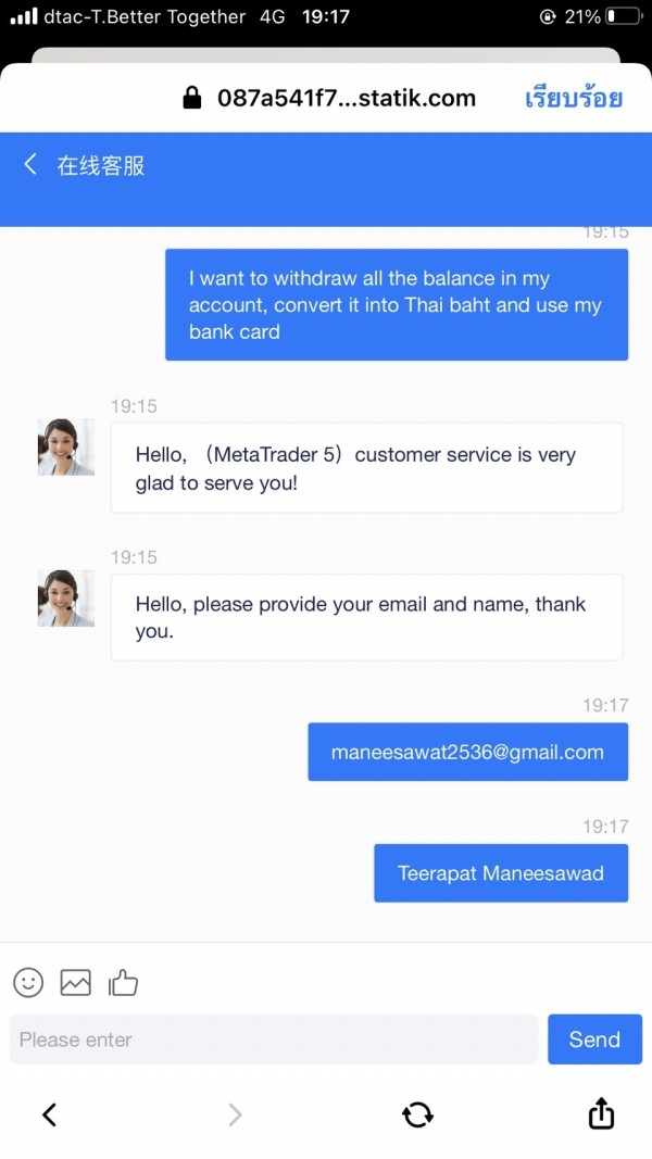 May nagmungkahi ng pakikipagkalakalan sa broker na ito. Nag-transfer ako ng pera sa unang pagkakataon para sa 1 daang libong baht at nakipag-trade sa sandaling makuha niya ang pulseras. Naisip kong bawiin ito, ngunit hindi ko ito mabawi. Pinapayagan ka nitong maglipat ng pera sa karagdagang humigit-kumulang 110000 baht upang ma-withdraw.