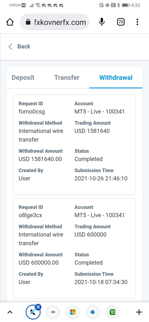 Ang aking trading account number sa fxkovneraa.com ay 100341. Mula Mayo hanggang unang bahagi ng Oktubre noong nakaraang taon, nakipagkalakalan ako sa foreign exchange at mahahalagang metal sa fxkovneraa.com (ang orihinal na platform ay tinatawag na sunton capital holding), na may prinsipal na humigit-kumulang 380,000 US dollars at isang tubo na higit sa 1.8 milyong US dollars. , sinisingil ako ng platform ng handling fee na $89,700 sa loob ng 4 na buwan. Noong nag-apply ako para sa withdrawal noong kalagitnaan ng Oktubre noong nakaraang taon, sinabihan akong magbayad ng buwis na $272,301 (sinabi ng platform na pinahintulutan sila ng Canada Revenue Agency na ipataw sa akin, tinanong ko ang Canada Revenue Agency CRA nang naaayon, at ang sagot ay na ang CRA ay hindi nagbigay ng ganoong pahintulot sa anumang internasyonal na ahensya, at ang aking kapital na kita ay dapat na ideklara at bayaran sa CRA nang mag-isa), kaya't isinasaalang-alang ko ang kahilingan ng fxkovner Ang pagbabayad ng buwis para sa platform na ito ay isang disguised na panlilinlang na katulad ng pagharang sa underworld ( upang pumasa mula rito, umalis upang bumili ng pera sa kalsada), dahil pinigil ng platform ang aking prinsipal at tubo na higit sa 2.18 milyong dolyar ng US, bilang isang kinakailangan para sa platform na pag-uusapan ay Magbayad ng $272,301 na buwis, magagawa ko lamang ang aking makakaya upang makalikom ng pera at magbayad ng mga buwis (sa kadahilanang ito, mayroon akong isa pang utang na higit sa 250,000 US dollars, kasama ang bank line credit na hiniram ko bago ako namuhunan sa fxkovner platform upang mag-isip tungkol sa foreign exchange, at ngayon ay mayroon na akong kabuuang higit sa 500,000 US dollars. US dollar debt, line credit), hanggang Enero 22 ng taong ito, nagbayad ako ng higit sa 251,000 US dollars sa mga buwis (kabilang dito, noong Enero 22, hiniling sa akin ng customer service ng fxkovner platform na magbayad ng buwis sa kanilang mga opisina sa Toronto , Canada). Sa account ng isang business partner, sinasabi na nag wire ako ng pera sa partner nila gwxu reno inc account ay kapareho ng wire transfer sa fxkovner capital holding account. Ang kumpanya ng kasosyong ito ay isang kumpanya ng konstruksiyon at dekorasyon sa Toronto. Pinindot ko Sa kahilingan ng customer service ng fxkovner, naglipat ako ng USD 8,607 sa gwxu reno inc. account sa araw na iyon. Pagkaraan ng dalawang araw, sinabi sa akin na hindi matanggap ni fxkovner ang pera mula sa gwxu reno inc., kaya pumunta agad ako sa aking bangko upang mag-apply para sa isang compulsory refund, ngunit para sa Huli na, ang aking pera ay nailipat sa gwxu reno inc account, at sinabi ni fxkovner na hindi ko pa natatanggap ang pera, kailangan kong ipagpatuloy ang pagbabayad ng mga natitirang buwis, nagsumbong ako sa pulisya ng Canada at umaasa na sa pamamagitan ng aking bangko at gwxu reno inc. Nabawi ng bangko ang aking $8,607 at sinabihan ng pulisya na walang posibilidad na mabawi), tinanong ko rin ang fxkovner platform tungkol sa aking kabuuang prinsipal at tubo na $2,182,301, kailan ko maibibigay ang pera, at sinabi sa platform na mayroon pa akong mga utang na halos $600,000 (mahigit 700,000 Canadian dollars) (ang bangko Sa anyo ng line credit, ang taunang interest rate ay 6.7%. Sa hinaharap, habang unti-unting itinataas ng bangko ang interest rate, ang loan interest rate. Ang foreign exchange trading account ng fxkovner capital holding ay na-freeze din ng fxkovner platform noong Nobyembre ng nakaraang taon, at walang mga transaksyon na maaaring isagawa sa ngayon. Ngayon ang aking account sa fxkovneraa.com ay nagpakita ng higit sa 2.18 milyon US dollars dalawang linggo na ang nakalipas. Na-clear ito ng fxkovner. Paulit-ulit akong nakipag-ugnayan sa platform ng serbisyo sa customer ng fxkovner para humingi ng tugon at makatwirang paliwanag (bakit ko na-clear ang aking higit sa 2.18 milyong US dollars hanggang 0), at ang tatlo e ang mga customer service account ay hindi na tumugon sa aking impormasyon. Agad akong umaasa na makakuha ng tulong mula sa nauugnay na institusyon.