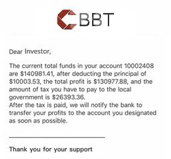 Sa kabila ng hindi bababa sa 6 na email sa iba't ibang miyembro ng kanilang team, wala akong tugon mula sa kumpanyang ito at walang nabayarang pondo . Unang sinabi sa akin ng BBT na nakabinbin ang aking pag-withdraw dahil pinaghihinalaan ako para sa money laundering. Walang saysay sa akin dahil sila mismo ang nagsagawa ng karamihan sa mga trade.