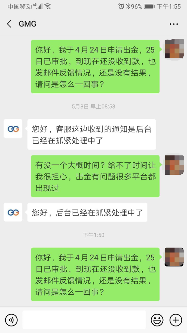 与我一同入金的几个人,4月25日申请出盈利无法出金,5月初申请出本金无法出金,现在联系客服也不回复了。GMG连官网也无法打开了,据说是已经跑路!