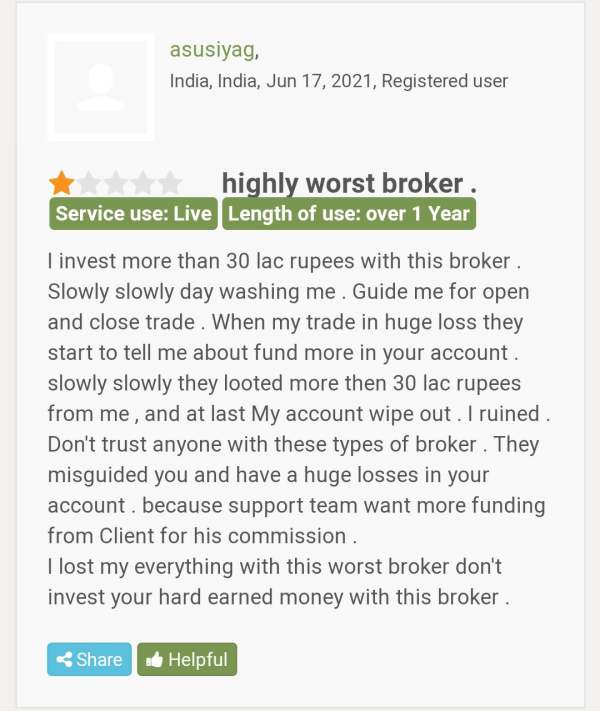 A client claims he lost more than 30 lac rupees after he was tricked into investing more and more by this broker so that they could earn more commission. He advised others to stay away from this broker.