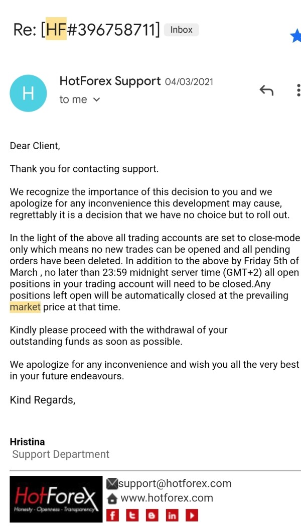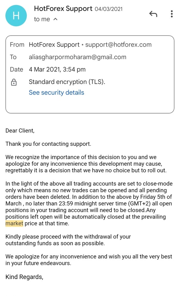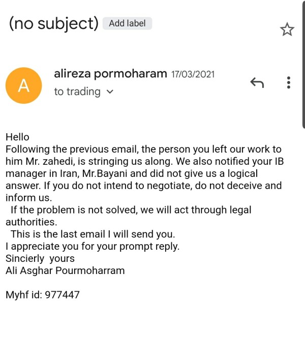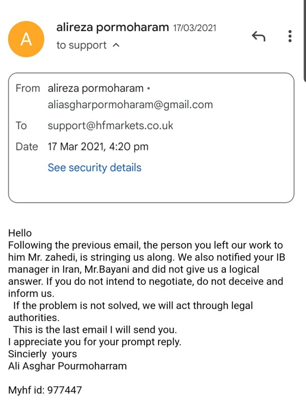 HF markets Date of sending the complaint to hf markets: March 12th, 2021 Date Today : Jun 24th,2022 Dear hf markets: I'm sending you this email to complain about exposing your business to Iran and against Iran imposed sanctions, that resulted your weird behaviors. The misconducting that caused me and my client' heavy losses. The parts that you are held liable for my losses are : 1 - By suddenly increasing the commissions and spreads , you made my account solely for the purpose of maximizing your commissions, which is a serious fraud. 2- You failed several times to provide me with the real-time securities prices, and to the worse, you sold some of my holdings/positions based on your unreal estimated prices which then found out to be far from the real prices. As those stocks were never reached at the prices that you made the transactions upon. You are definitely liable for the losses that resulted. 3 - By not allowing to hedge my positions, you took away all the tools that you had to make available to me to stop the losses. If you were complying with the regulations on sanctions against Iran, you didn't have to cut us off in the middle of our active transactions, and to make us huge losses. Sanctions and restrictions are imposed by authorities in the US, EU and elsewhere. The penalties for breaching sanctions are severe. All companies which trade with Iran or which make or receive payments to or from natural persons in Iran are subject to those penalties. I'm entitled to receive all the money that That you have harmed me and my client by not following the rules The exact amount that I expect to get back is ..... After a very long time, no action was taken against my protest Hereby I notify you, if you do not resolve this I will file complaints with the appropriate consumer agencies , as well as with FINRA , with authorities in the US, EU , with your base country and consider my legal alternatives My hf :977447